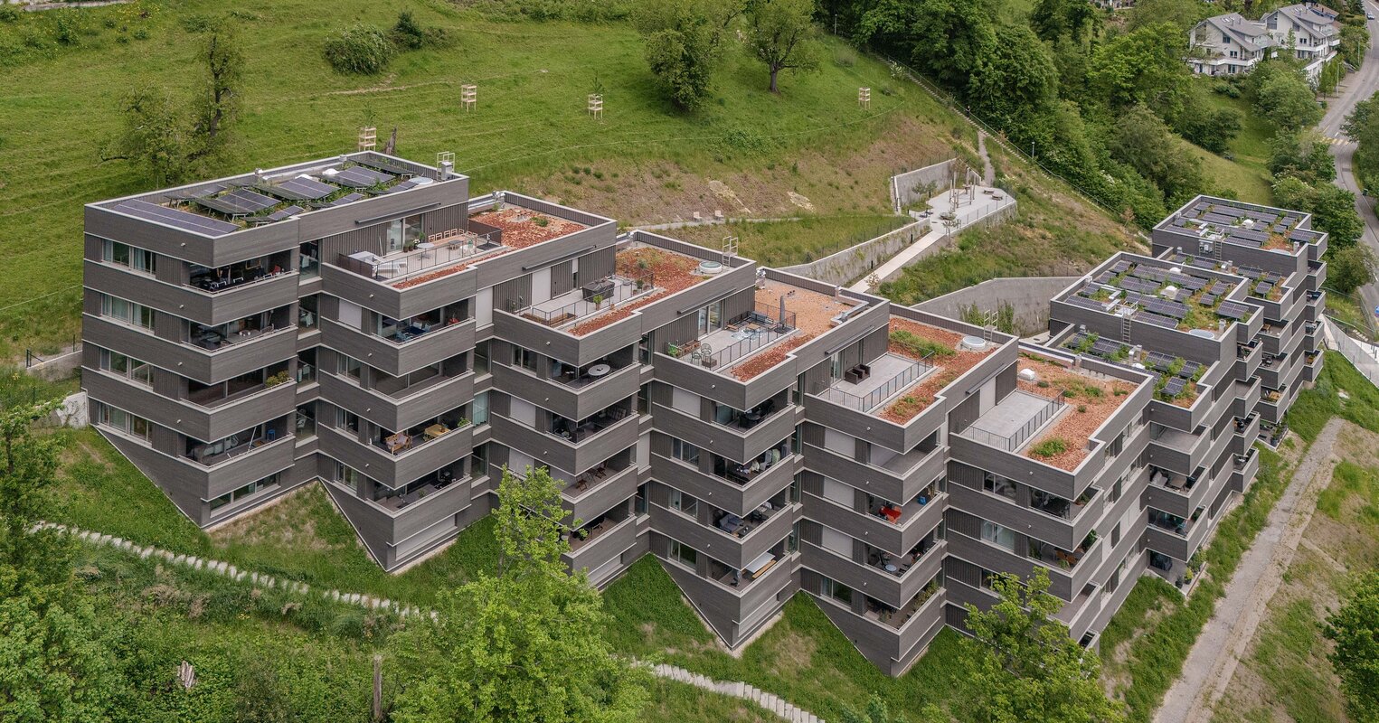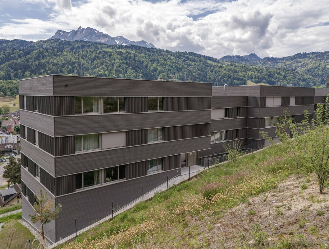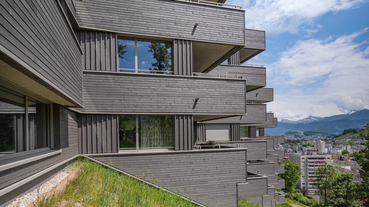 Das Grundstück Mülirain liegt an steiler, südorientierter Hanglage etwas ausserhalb des zentralen Siedlungsgebietes von Kriens. Nebst der topographischen Herausforderung sind die umgebenden Bauten von disperser Qualität und uneinheitlich. Das Projekt mit 38 sowohl klein- als auch grossmassstäblichen Wohnungen konzentriert sich deshalb auf die vorgefundenen, räumlich wirkenden Freiraumstrukturen in Form der das Grundstück begleitenden Hecken, Gehölze und Bäume. Die Wohnüberbauung orientiert sich daher an den vorgefundenen topographischen und landschaftsbestimmenden Elementen. Die nördlich des Perimeters gelegene horizontale Terrainkante, sowie die Hecken entlang der Strasse formulieren eine mit Obstbäumen besetzte Landschaftskammer, die möglichst erhalten, verstärkt und mit der Umgebung ökologisch vernetzt werden soll. Entlang der südwestlichen Parzellengrenze wurde deshalb ein gestaffelter, parallel zu den Höhenlinien ausgerichteter Baukörper mit möglichst kleinem Fussabdruck entwickelt. Die natürlich wirkende Holzfassade unterstreicht die Absicht der Integration in die Landschaft.