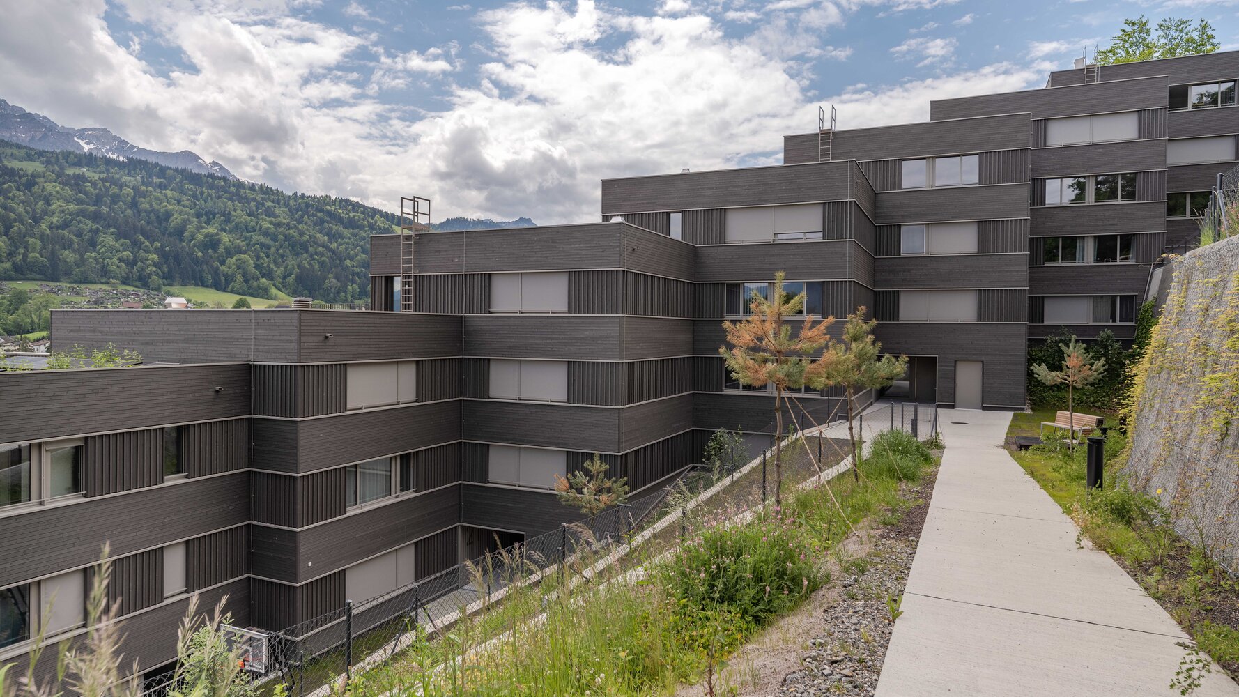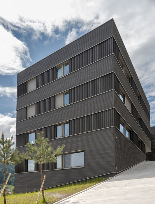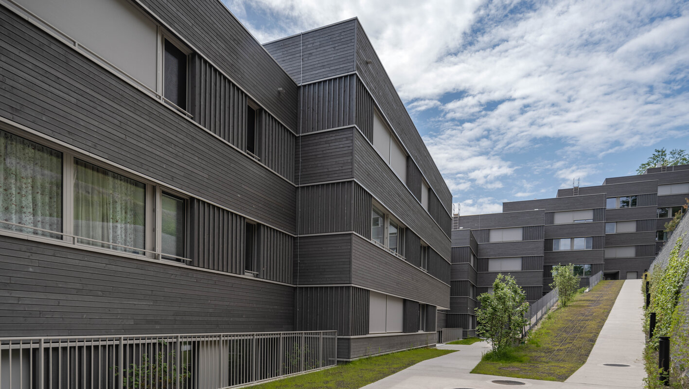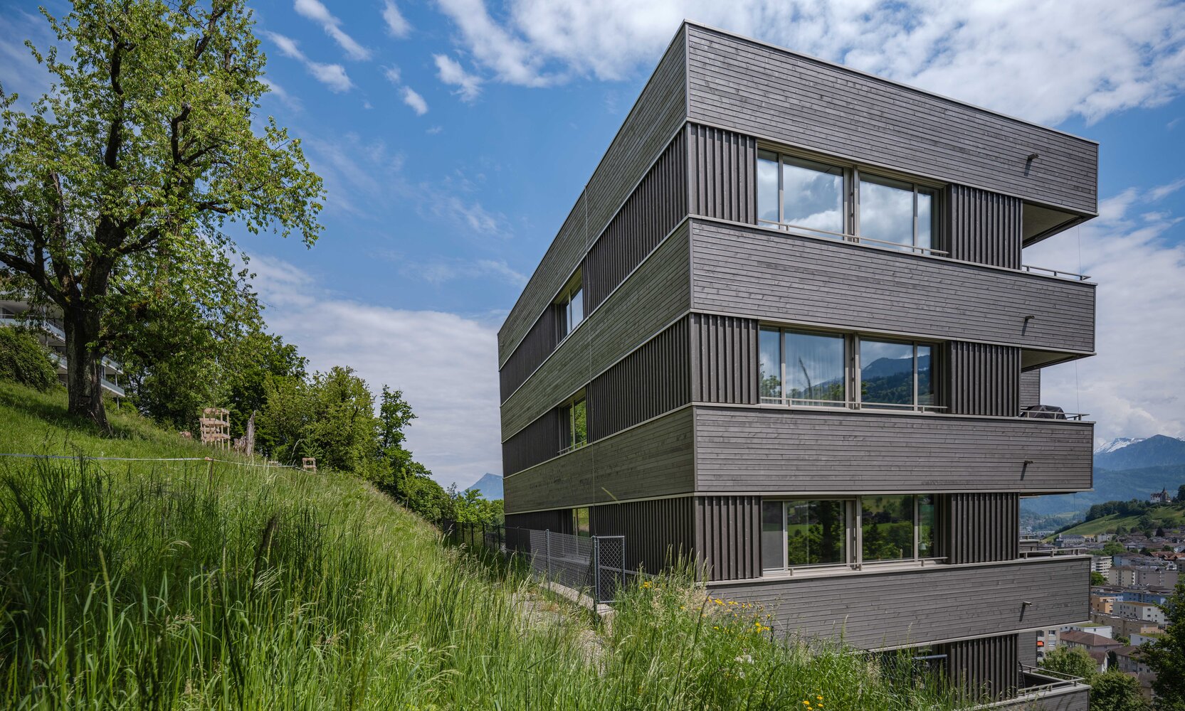 Das Grundstück Mülirain liegt an steiler, südorientierter Hanglage etwas ausserhalb des zentralen Siedlungsgebietes von Kriens. Nebst der topographischen Herausforderung sind die umgebenden Bauten von disperser Qualität und uneinheitlich. Das Projekt mit 38 sowohl klein- als auch grossmassstäblichen Wohnungen konzentriert sich deshalb auf die vorgefundenen, räumlich wirkenden Freiraumstrukturen in Form der das Grundstück begleitenden Hecken, Gehölze und Bäume. Die Wohnüberbauung orientiert sich daher an den vorgefundenen topographischen und landschaftsbestimmenden Elementen. Die nördlich des Perimeters gelegene horizontale Terrainkante, sowie die Hecken entlang der Strasse formulieren eine mit Obstbäumen besetzte Landschaftskammer, die möglichst erhalten, verstärkt und mit der Umgebung ökologisch vernetzt werden soll. Entlang der südwestlichen Parzellengrenze wurde deshalb ein gestaffelter, parallel zu den Höhenlinien ausgerichteter Baukörper mit möglichst kleinem Fussabdruck entwickelt. Die natürlich wirkende Holzfassade unterstreicht die Absicht der Integration in die Landschaft.